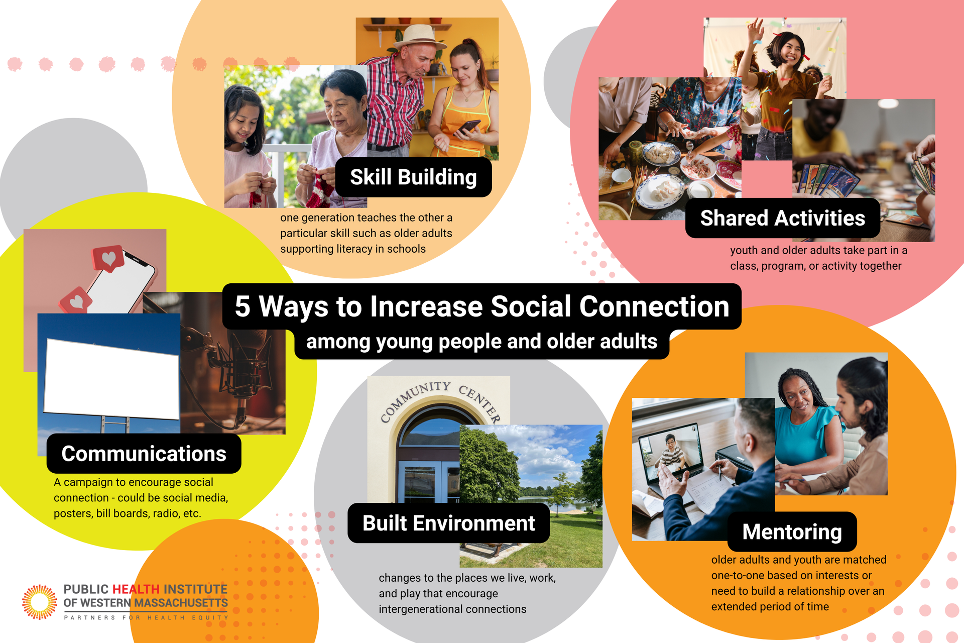 While social isolation has long been identified as a concern for older adult populations, COVID-19 amplified the risk of it and awareness that we need increased attention to preventative efforts and interventions for both youth and older adults. The Intergenerational Social Connections (ISC) project builds on the Public Health Institute of Western Massachusetts' Live Well Springfield Age-Friendly Initiative, the Youth Mental Health Roadmap for Western MA, and the Youth Mental Health Coalition to assess strategies, opportunities, and programming for social connection and social inclusion from an intergenerational perspective. Drawing on the Age-Friendly framework domain of Respect and Social Inclusion and the Youth Mental Health Roadmap, we are focusing on what supports, enhances, or creates challenges to intergenerational connection in Springfield.